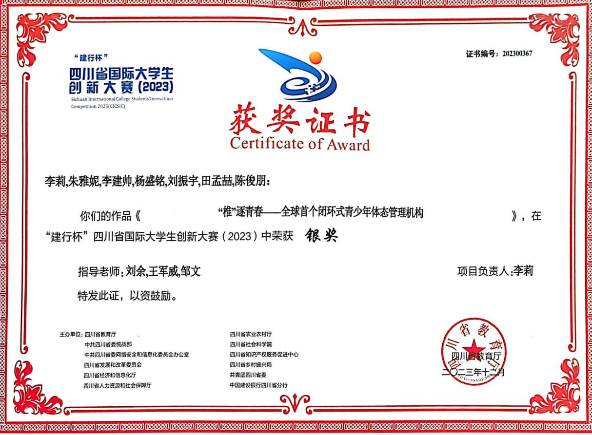 颁奖环节,公司《“椎”逐青春——全球首个闭环式青少年体态管理机构》荣获“建行杯”四川省国际老员工创新大赛(2023)银奖,员工代表朱雅妮代表参赛获奖团队上台领奖。公司另有《“小火炬”运动处方——铸就老年人健康无忧“医体”生活》荣获红旅赛道铜奖。
