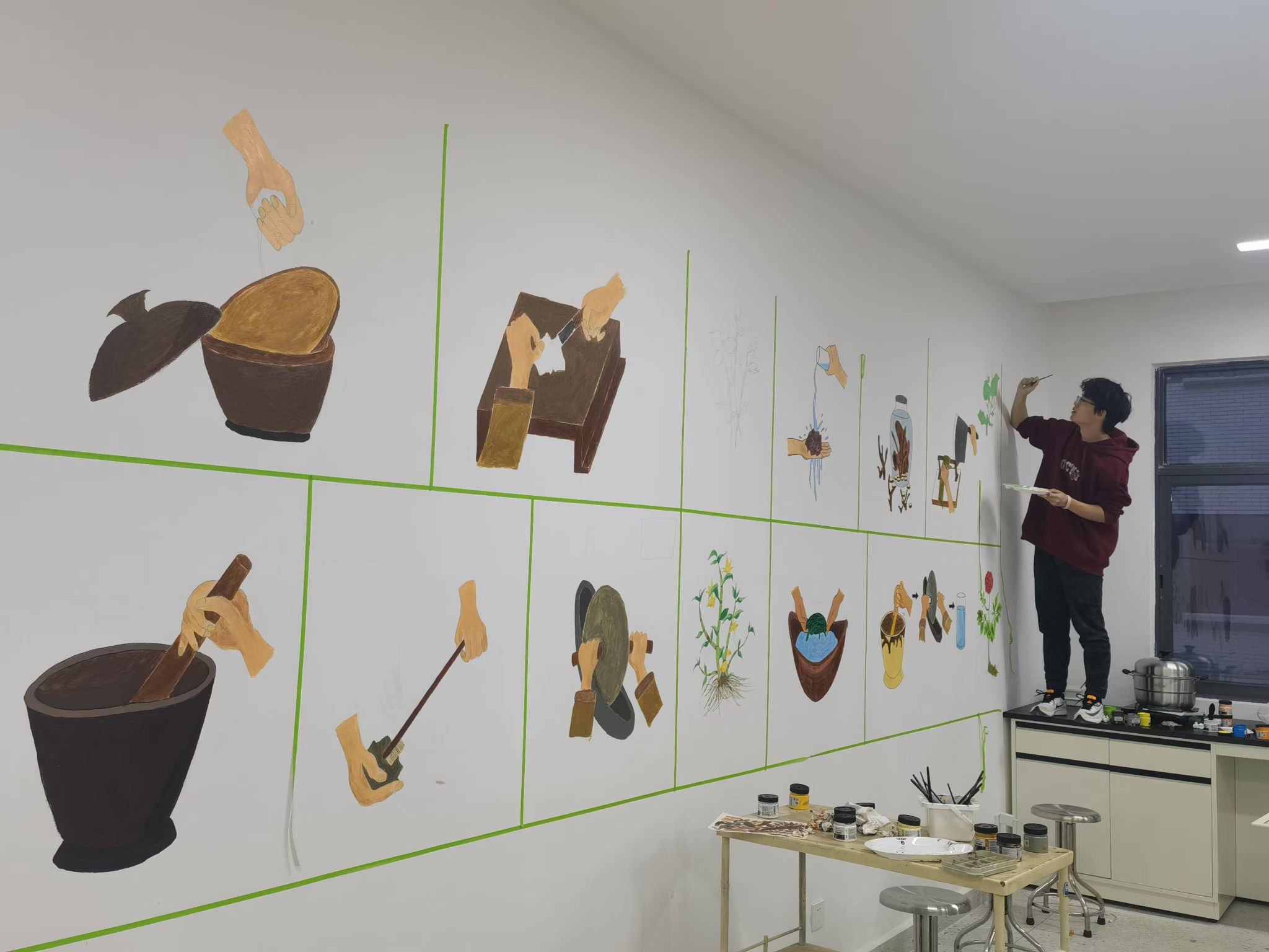 壁画绘画让中药炮制室焕然一新,生动展现了中药炮制的不同方法和各个环节——修制,筛选,剪切,粉碎,刷净,碾,水制(淋洗,润、泡,切片,润洗,水飞),火制(炒,煅,炙,烘焙),水火同制(蒸,煮,炖,淬,炮)。从净制、切制到炮制,每一个步骤都栩栩如生。这些壁画不仅是艺术的展现,更是对中药炮制这一传统技艺的生动诠释,使员工们在实践操作中能够更好地理解炮制工艺的精髓,体会其中蕴含的中医药智慧。