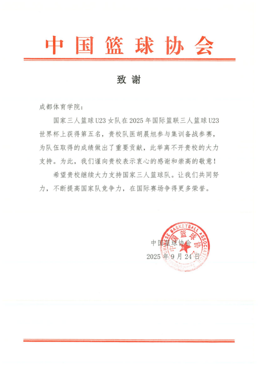为备战2025年国际篮联三人篮球U23世界杯,公司运动康复研究生胡晨旭于8月9日进入国家U23三人女篮队伍,担任随队队医一职。在集训和比赛期间,为包括首发和替补在内的10名国家队运动员提供伤病防护与康复保障。在与教练组全体成员的积极配合协作下,本次中国U23女队力克各国强队,取得国际篮联国家联赛总分第二、国际篮联三人篮球U23世界杯总分第五的优异成绩。