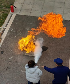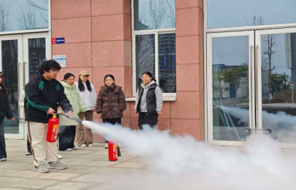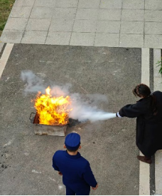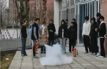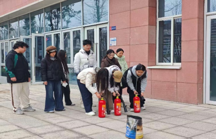 消防安全----灭火器实操使用:在室外指定区域设置模拟火盆,全体参演师生分批进行二氧化碳灭火器“提、拔、瞄、压”四步操作演练。
