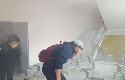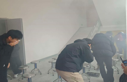 消防安全----火场疏散逃生演练:模拟实验室内突发火情,组织师生低姿捂鼻、沿疏散指示标志快速撤离至安全集合点。