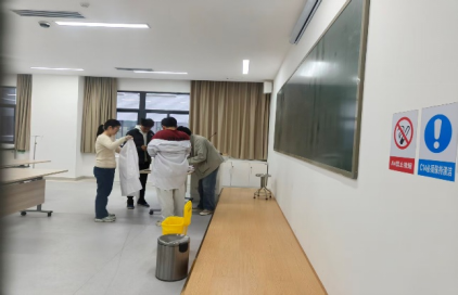 生物安全-----病原微生物洒溢处理:在实验室模拟微生物样本意外泼洒,演练人员严格按照生物安全操作规程进行消毒、生物废弃物处置与上报等。