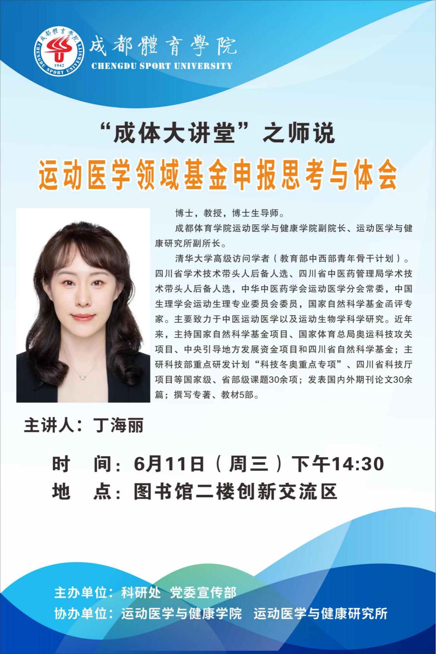 集团将于2025年6月11日(周三)下午14:30在图书馆二楼创新交流区举行“成体大讲堂”科研讲座系列活动之师说。本次讲座特邀yl23455永利集团副经理丁海丽教授主讲。题目为:《运动医学领域基金申报思考与体会》。欢迎全校师生积极参加。