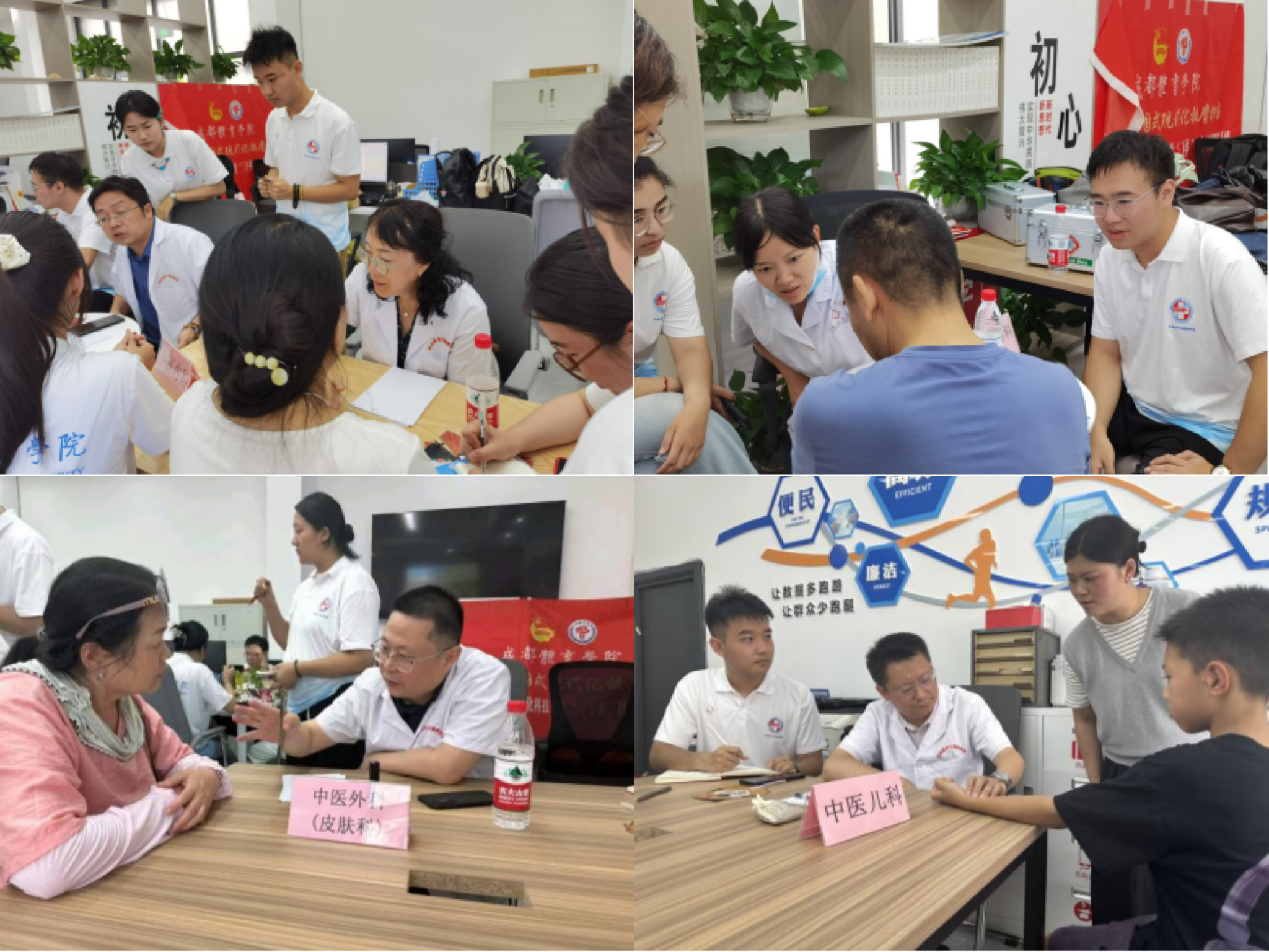 义诊现场设置中医儿科、妇科、内科、外科和骨伤科五个诊疗区。专家团队耐心细致地为居民把脉问诊、分析病情,并为他们提供个性化调理方案。实践团志愿者协助开展健康宣教等工作,并向群众普及中医养生知识。