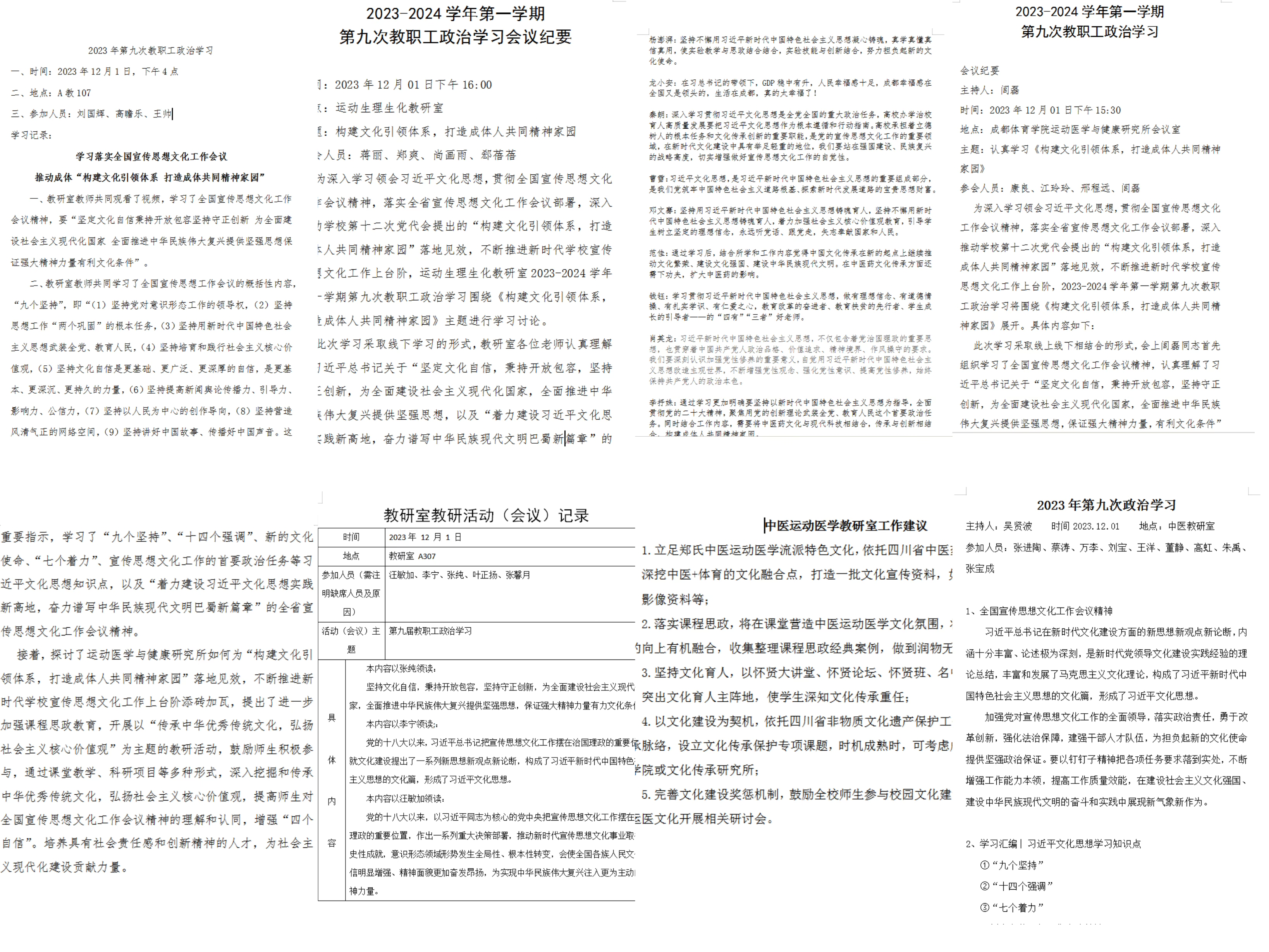 为深入学习领会习近平文化思想,贯彻全国宣传思想文化工作会议精神,12月1日下午,医公司组织全体教职员工开展了2023年第九次教职工政治学习活动。根据公司相关通知要求并结合公司实际情况,本次活动由各教研室以科室为单位进行组织学习。